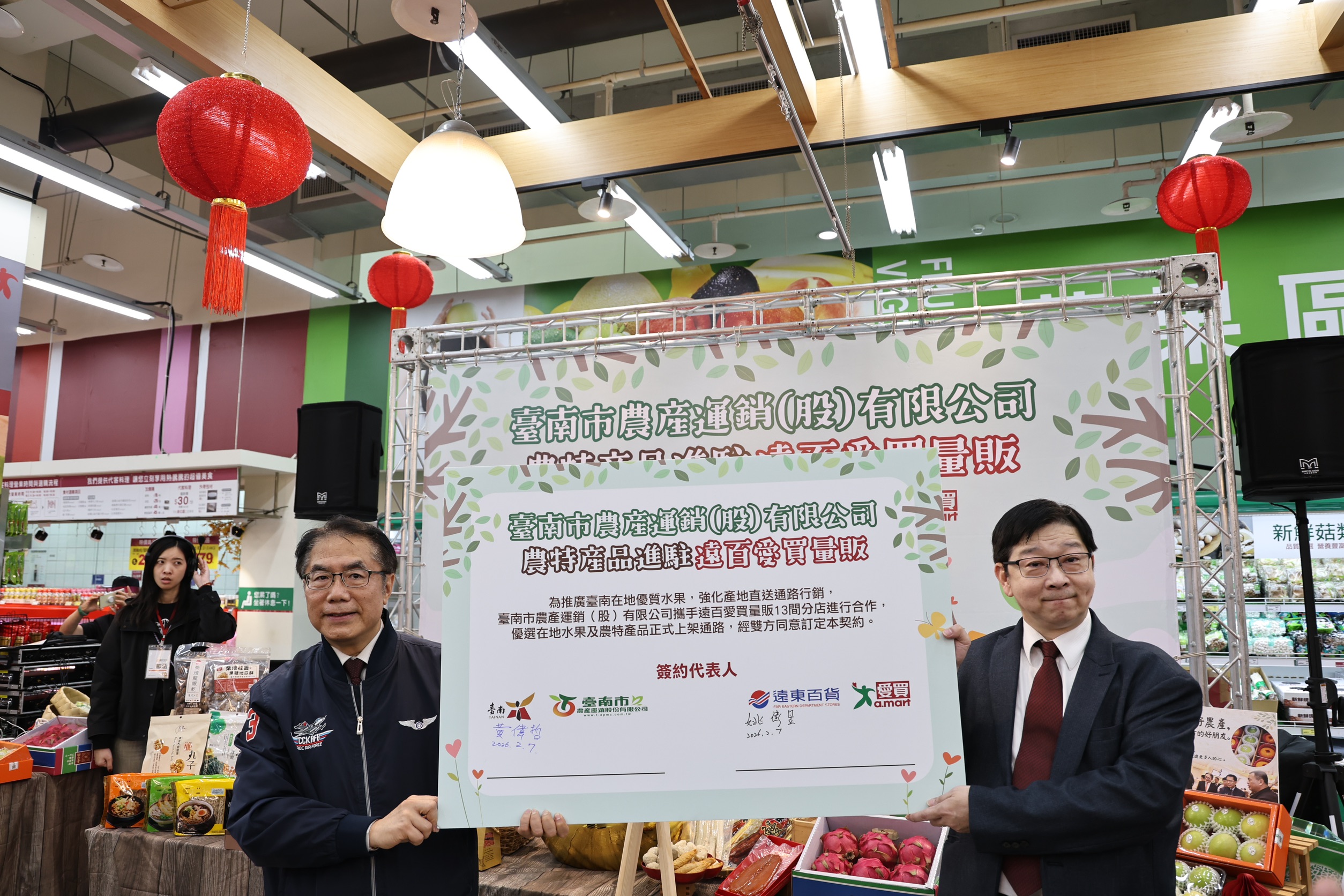 遠東百貨副總經理陳佑任表示,遠百愛買已與台南市政府完成合作備忘錄(MOU)簽署,將於全台 13 家愛買量販門市上架推廣臺南優質農漁產品,讓消費者能就近選購品質新鮮、價格實惠的台南好物。此次活動除於板橋、桃園等門市推廣外,也配合年節採買需求,提供多元農特產品作為年貨與年菜選擇。愛買營運長姚偉昱也進一步說明,未來愛買將依季節規劃持續辦理展售與推廣活動,優先引進最新鮮的台南農產,並逐步擴大合作品項,讓更多北部及全台消費者,都能在愛買通路輕鬆購買到台南最優質的農特產品。